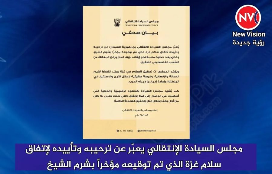 أصدر مجلس السيادة الإنتقالي عبّر فيه عن ترحيبه وتأييده لإتفاق سلام غزة الذي تم توقيعه مؤخرًا بشرم الشيخ واصفاً له بأنه يُعد خطوة مهمة نحو إيقاف نزيف الدم ورفع المعاناة عن الشعب الفلسطيني الشقيق.