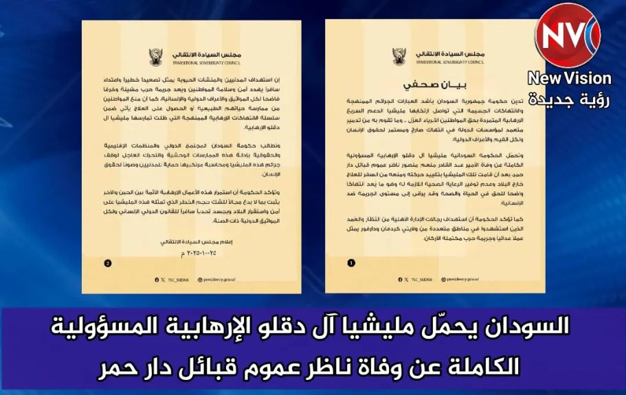 أصدر مجلس السيادة الإنتقالي بياناً أدان فيه بأشد العبارات الجرائم الممنهجة والانتهاكات الجسيمة التي تواصل ارتكابها مليشيا الدعم السريع الإرهابية المتمردة بحق المواطنين الأبرياء العُزّل وما تقوم به من تدميرٍ متعمدٍ لمؤسسات الدولة في انتهاكٍ صارخٍ ومستمر لحقوق الإنسان ولكل القيم والأعراف الدولية ، ويحمّل مليشيا آل دقلو الإرهابية المسؤولية الكاملة عن وفاة الأمير عبد القادر منعم منصور ناظر عموم قبائل دار حمر، بعد أن قامت تلك المليشيا بتقييد حركته ومنعه من السفر للعلاج خارج البلاد ، وفيما يلي نص البيان :